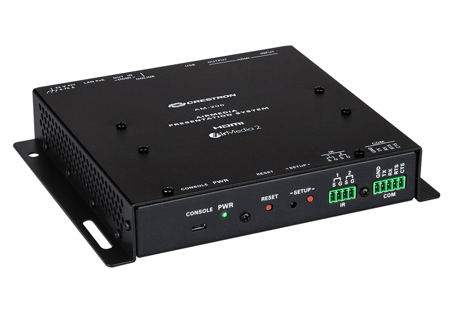 Thiết bị AM-200 lắp ẩn sau màn hình treo tường và có thể sử dụng có dây hoặc không dây với chức năng tự chuyển đổi. Nó có tính năng thuyết trình không dây tích hợp sẵn AirMedia 2.0, cùng với đầu vào HDMI®, HDMI output ra màn hình (HD hoặc UHD) và điều khiển bật / tắt màn hình tự động qua CEC, RS232 hoặc IR. Việc kết nối nguồn qua AirMedia hoặc HDMI sẽ tự động chọn đầu vào đó và hiển thị ngay lập tức hình ảnh nguồn trên màn hình. Không yêu cầu lập trình, không cần dongle để cắm vào và cũng không có điều khiển từ xa (dễ mất hoặc hết pin thay thế).