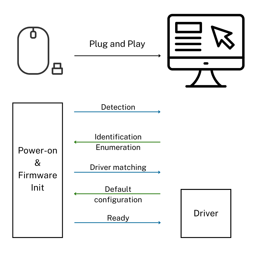 Để hiểu rõ cơ chế plug and play, chúng ta có thể hình dung theo chuỗi các sự kiện diễn ra tự động từ thời điểm thiết bị được kết nối: